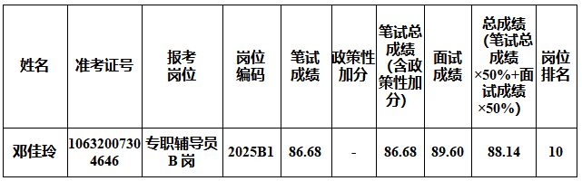因本次公招报考岗位编码2025B1,排名第五考生自愿放弃,按公告要求,现递补符合条件报考岗位编码2025B1排名第十考生进入体检环节,具体情况如下: